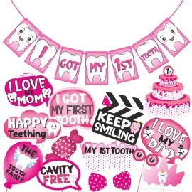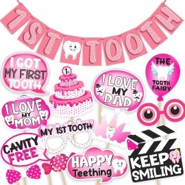 Wobbox First Tooth Photo Booth Party Props (13 Pcs) with I Got My 1st Tooth Bunting Banner, Pink Colour Stylish Font, First Tooth Decoration, First Tooth Decoration Items for Baby..