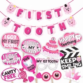 Wobbox First Tooth Photo Booth Party Props (13 Pcs) with First Tooth Bunting Banner, Pink Colour Stylish Font, First Tooth Decoration, First Tooth Decoration Items for Baby