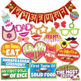 WOBBOX Annaprashan Photo Booth Party Props with Bunting Banner Hindi Shubh Red & Golden Color Font, Decoration Item..