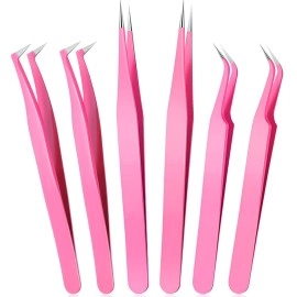 High Precision Lash Tweezers Set 6 Pack Stainless Steel Eyelash Extension Tweezers for Classic, Volume, Mega Volume Lashes, Facial Hair, Eyebrow, Hair Removal, Crafting Making(Pink)