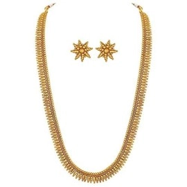 This jewellery set is crafted in gold plating and consists of a necklace, and a pair of earrings. The long necklace feature pearl-studded in it and is secured with a drawstring closures. Style this necklace set with a saree or a salwar suit to enhance the look. This jewelry set is a great option and a perfect pick for your wedding functions. Be ass..