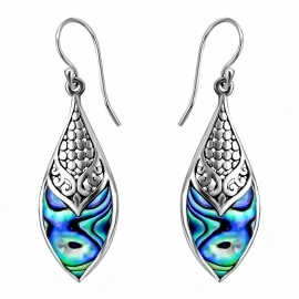 These abalone shell drop earrings from the Bali Legacy Collection will surely amp up your style to the next level. These fancy earrings showcase a beautiful soft scrollwork on half frame and greenish-blue hues of abalone on the other half. Grace your earlobes and enjoy the limelight. Crafted in stamped 925 sterling silver Artisan crafted Durable an..