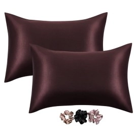GO WELL Satin Silk Solid Pillow Covers 400 Tc Pack Of 2 For Hair And Skin-With Satin Scrunchies For Women Stylish|Satin Pillow Coves For Hair And Skin|Scrunchies For Women 3-Piece|Pillow Case(Brown)