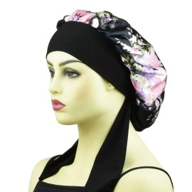 TALE KING (Black Flower) - Satin Sleep Bonnet Cap for Women, Wide Band Satin Sleeping Caps Night Hat Head Cover for Natural Hair Loss, Black Flower